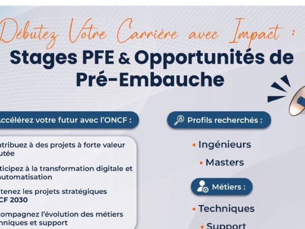 Vous recherchez des stages PFE et des opportunités de pré-emploi ? Rejoignez l’ONCF, Stages disponibles dans plusieurs villes du Royaume : Casablanca, Rabat, Tanger, Meknès, …